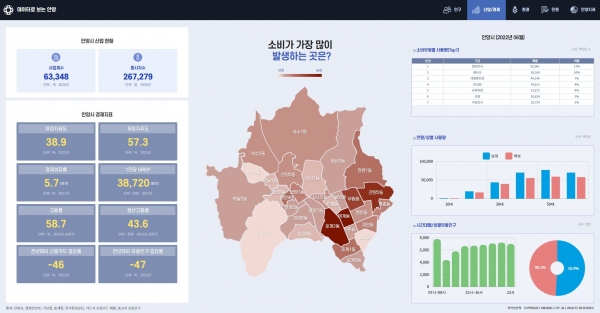 빅데이터 분석을 기반으로 안양의 인구 산업/경제 환경 민원 안양지표 등 5개 주제를 지역별 데이터로 제공하고 있다.