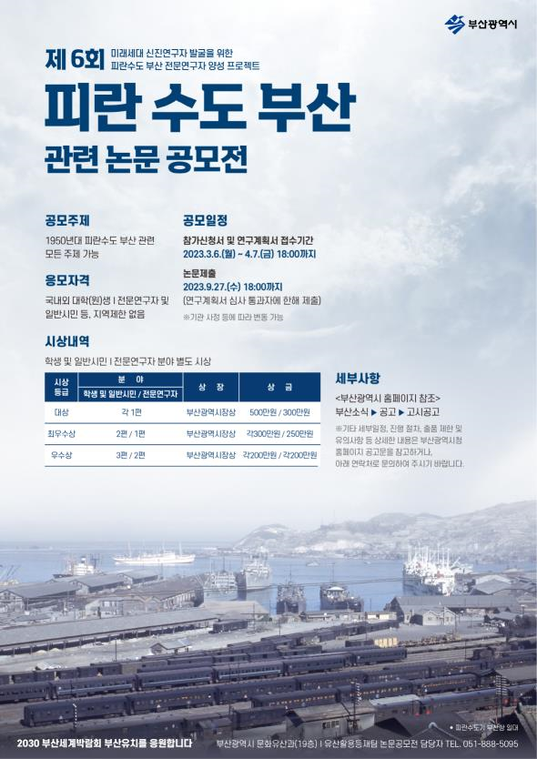 [충청뉴스큐] 부산시는 피란수도 부산유산의 세계유산 등재 추진을 널리 홍보하고 이 분야의 미래세대 전문가를 양성하기 위해 ‘제6회 피란수도 부산 논문공모전’을 개최한다고 밝혔다.
