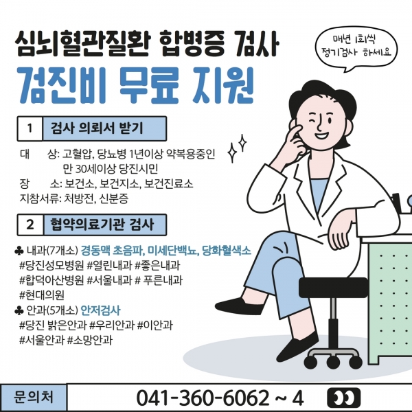 [충청뉴스큐] 당진시 보건소가 3월부터 예산 소진 시까지 고혈압, 당뇨병 질환자들에게 심뇌혈관질환 합병증 검사를 무료로 시행한다.