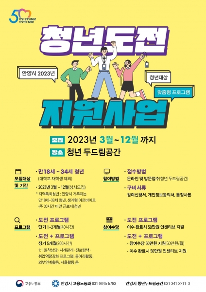 [충청뉴스큐] 안양시가 구직단념 청년들이 구직의욕을 갖고 노동시장에 참여할 수 있도록 상담 및 맞춤형 프로그램을 지원하는 ‘청년도전 지원사업’ 참여자를 모집한다고 27일 밝혔다.