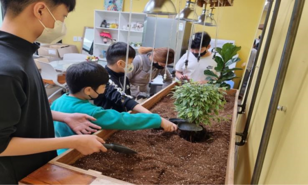 이번 원예 치유 프로그램은 그림책과 함께하는 꽃꽂이 환경교육과 함께 하는 재활용을 이용한 테라리움 만들기 프리저브드를 이용한 내 얼굴 꾸미기 아이들과 함께 만드는 자동화 정원 가드닝 등을 내용으로 매그놀리아플라워 강영희 대표의 재능기부로 진행됐다.