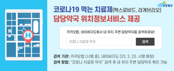 코로나19 먹는 치료제의 담당약국 위치정보는 카카오맵과 네이버지도를 통해 검색 가능하며 검색창에 ‘코로나 치료제 약국’을 검색하면 내 위치 주변에 있는 담당약국을 손쉽게 확인할 수 있다.