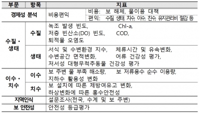 이수와 치수는 보 주변 물부족 해소, 보 저류용수의 이용, 지하수 활용의 변화, 홍수 대비 능력 등 5개 지표로 평가됐다.