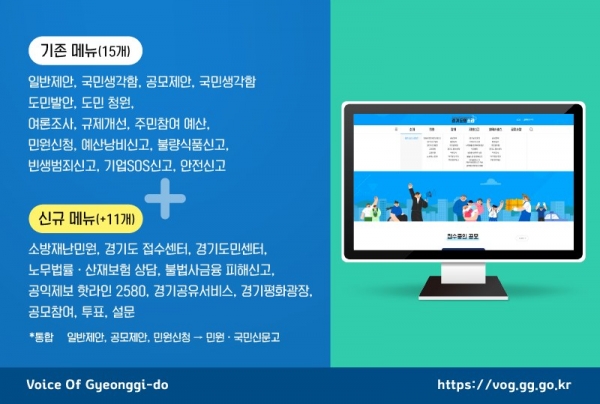 기존의 국민신문고 경기도민 청원, 경기도민 발안, 통합공모, 여론조사 등의 링크 외에 확대된 메뉴는 소방재난 민원 경기도 접수센터 경기도민센터 페이지 경기노동권익센터 경기도 불법사금융 피해신고센터 공익제보 핫라인 경기 공유서비스 경기평화광장 등으로 도민의 각종 민원과 상담, 신고 창구를 경기도의 소리에서 쉽게 접근할 수 있도록 했다.