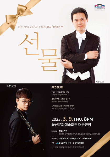 이번 공연은 지난해 11월 신규 위촉된 박윤환 부지휘자가 울산시립교향악단과 함께 시민들에게 처음으로 클래식 선율을 선사하는 자리이며 오보에 협연자로 임유빈 차석단원이 무대에 오른다.