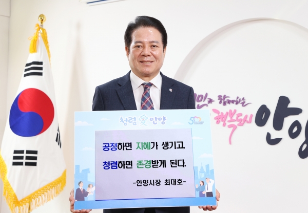 첫 번째 주자로 나선 최대호 안양시장은 이날 ‘공정하면 지혜가 생기고 청렴하면 존경받게 된다’는 청렴 메시지로 사진을 찍어 청렴愛안양에 게시했다.
