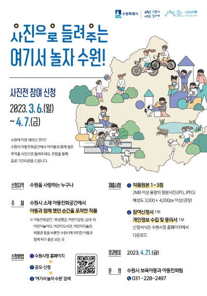 ‘사진으로 들려주는 여기서 놀자 수원’은 수원시에 있는 아동친화공간에서 아동과 함께한 순간을 포착한 사진을 공모하는 것이다.