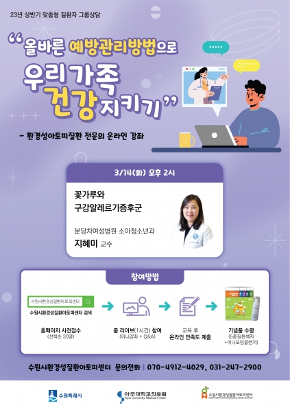 [충청뉴스큐] 수원시환경성질환아토피센터는 ‘2023년 제2회 맞춤형 질환자 그룹상담’과 ‘2023년 제2회 환경보건 공개강좌’를 온라인으로 연다.