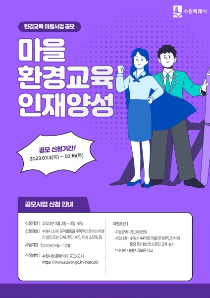 수원시는 ‘마을 환경교육 인재양성사업’을 주관할 단체를 3월 16일까지 공개 모집한다.