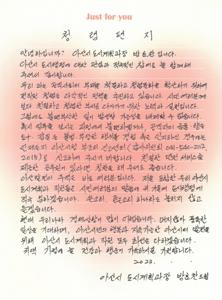 [충청뉴스큐] 아산시 도시계획과에서 올해 ‘1부서 1청렴 시책’으로 시작한 ‘청렴 편지’가 화제다.