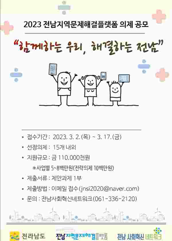 [충청뉴스큐] 전라남도는 지역 주민과 민간단체, 공공기관 등 민·관이 협업해 지역 문제를 해결하는 ‘2023년 지역문제해결플랫폼 실행의제’를 오는 17일까지 모집한다고 밝혔다.