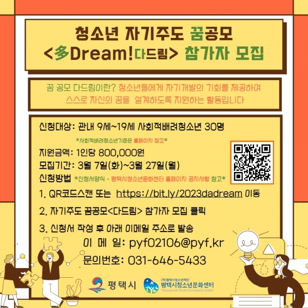 [충청뉴스큐] 평택시가 주최하고 평택시청소년문화센터가 주관하는 사회적 배려 청소년 대상 자기주도 꿈 공모 ‘다드림’ 사업 참가자를 오는 27일까지 모집한다.