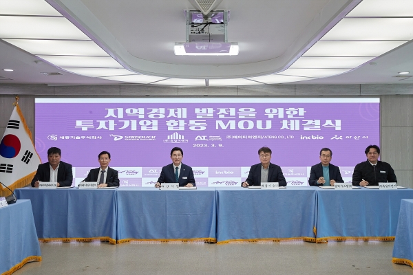 박경귀 시장은 지난 9일 시청 상황실에서 이시원 세종기술 대표, 이동재 삼덕시스템 대표, 최용근 ㈜유일이엔지 대표, 강현규 ㈜에이티이엔지 대표, 정동화 ㈜아이엔씨바이오 대표와 본사·공장 이전 및 제조공장 신·증설을 위한 합동 투자협약을 체결했다.