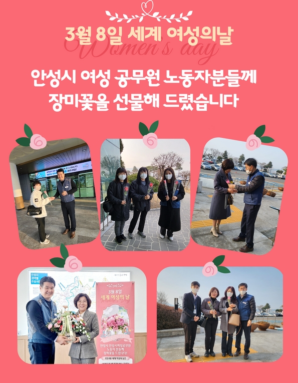 이날 노동조합 간부들은 이른 아침 제일 먼저 출근해 안성시청 청사를 청소하시는 여성 청소근로자를 시작으로 민선8기 여성 시장인 김보라 시장까지 직책에 상관없이 장미꽃을 전달했으며 이를 받은 여성 공직자는 “출근길에 예쁜 꽃을 받으니 하루종일 기분이 너무 좋았어요. 생각지도 못한 선물을 받은 느낌이다”고 소감을 밝혔다.