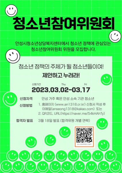 [충청뉴스큐] 안성시청소년상담복지센터는 ‘안성시 청소년참여위원회’ 위원 20여명을 오는 17일까지 모집한다.