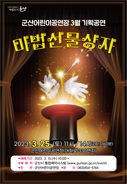 [충청뉴스큐] 군산시가 오는 25일 11시와 오후 2시에 군산어린이공연장에서 어린이 마술공연 ‘마법선물상자’를 공연한다.