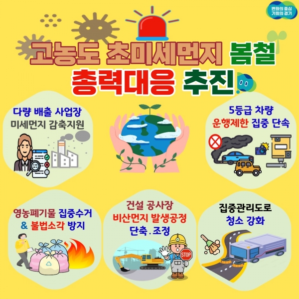 또한 도로 이동오염원을 줄이기 위해 살수차와 분진흡입차 운행을 확대하고 노후경유차 운행제한 단속과 조기폐차 및 저감장치장착 보조금 지원을 지속적으로 추진할 계획이라고 전했다.