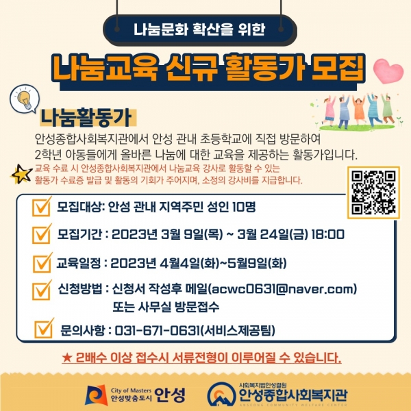 [충청뉴스큐] 안성종합사회복지관에서는 안성시 평생학습 우수 프로그램 지원사업으로서 안성시에서 지원을 받아 지역 사회 내 나눔문화 확산을 위한 2023년 나눔교육 신규활동가를 3월24일까지 모집한다.