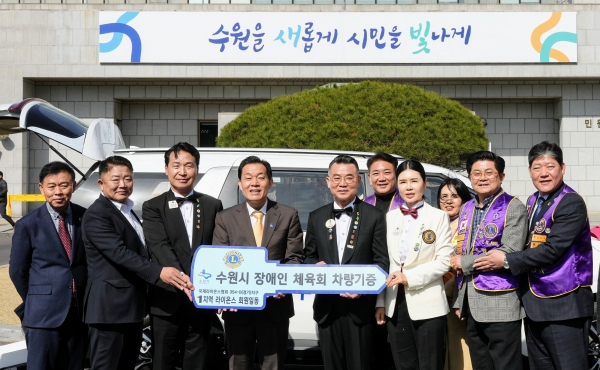 13일 수원시청에서 열린 차량 전달식에는 이재준 수원특례시장, 국제라이온스협회 354-B지구 이기열 총재·홍순만 사무총장, 장애인체육회 김종환 수석부회장·조원경 이사 등이 참석했다.