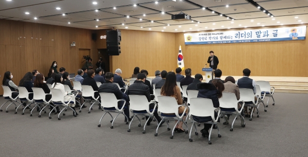 이날 강의는 ‘리더의 말과 글’이라는 주제로 강원국 작가를 초빙해 약 2시간 동안 진행했으며 단순한 지식 전달이 아닌 청중과 함께 소통하는 형식으로 화기애애한 분위기 속에서 이루어졌다.