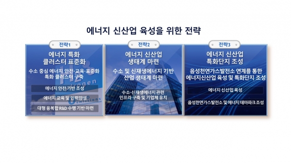 군의 ‘에너지 신산업 육성’의 핵심 전략은 에너지 안전·교육·표준화 특화 클러스터 구축 에너지 기반 신산업 생태계 마련 에너지 신산업 육성 및 특화단지 조성이다.