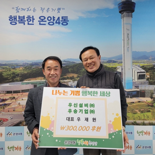 [충청뉴스큐] 우신설비건설이 지난 13일 온양4동 행복키움추진단에 이웃을 돕기 위한 후원금 삼십만원을 전달했다.