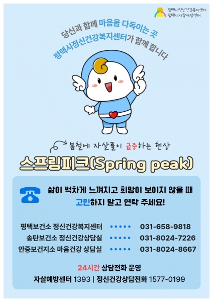 이에 평택시 평택·송탄보건소에서는 봄철 자살 고위험 시기를 대비해 해당 기간을 자살 예방 집중 관리 기간으로 정하고 자살 예방 캠페인 직장인 생명지킴이 양성 교육 메타버스 시민 정신건강상담실 운영 생애주기별 자살 예방 교육 자살 빈발지역 대교 등 안내문 게시 아파트 및 부동산 등 협약 등 지역사회 밀착관리를 진행할 예정이다.