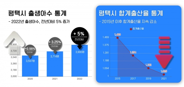 평택시는 인구 전입에 따라 2022년 출생아 수는 3,900명으로 점차 증가하고 있지만 합계출산율은 2015년 이후 감소하고 있어 출산율을 높이기 위한 대책 마련이 필요한 상황이다.