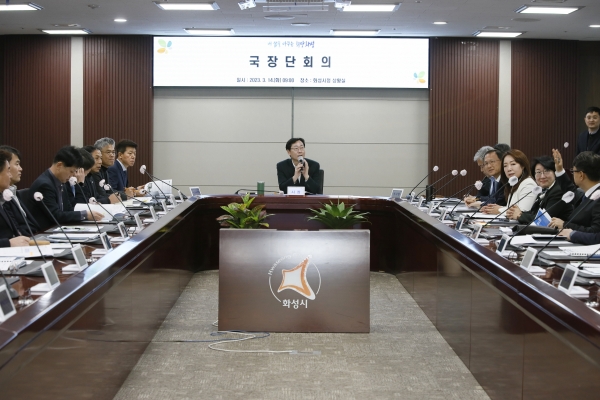 [충청뉴스큐] 화성시가 14일 상황실에서 실·국장 이상 간부, 주요 부서장 및 공공기관장 등 60여명이 참석한 가운데 국장단회의를 열고 청렴실천 의지를 다졌다.