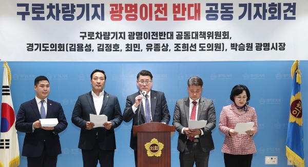 [충청뉴스큐] 경기도의회 광명시 도의원인 유종상, 김정호, 김용성, 최민, 조희선 도의원은 13일 경기도의회 기자회견실에서 구로차량기지 광명이전 결사반대를 선언했다.