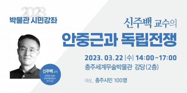 첫 강의인 1회 시민강좌는 22일 수요일 세계무술박물관 2층 강당에서 오후 2시부터 5시까지, 천안 독립기념관 한국독립운동사연구소장을 역임한 신주백 교수가 ‘안중근과 독립전쟁’이라는 주제로 강연을 펼친다.