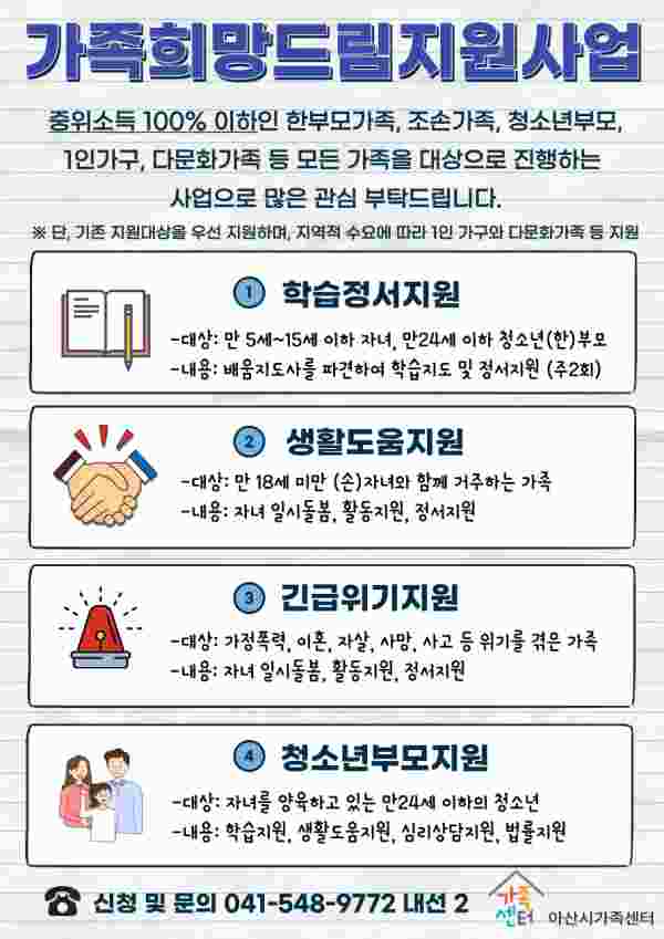 [충청뉴스큐] 아산시가 취약·위기 가족의 복합적인 문제 해결과 정서·경제적 자립역량 강화를 지원하는 ‘가족희망드림 지원사업’을 추진한다.