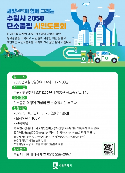 [충청뉴스큐] 수원시가 ‘새빛과 함께 그리는, 수원시 2050 탄소중립 시민토론회’에 참여할 시민 100명을 3월 20일까지 모집한다.