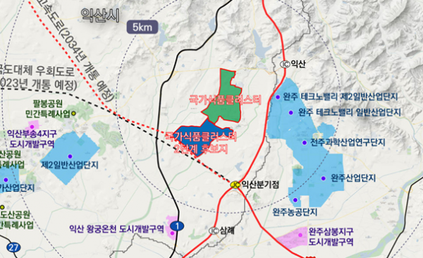 익산 국가식품클러스터 2단계 국가첨단산단은 오는 ‘28년까지 익산시 왕궁면 일원에 3,855억원을 투자해 2.07㎢ 규모로 조성할 예정이며국가식품클러스터 2단계 국가첨단산단 후보지는 기존 산단에 위치한 12개 기업지원시설과 2단계에 도입 예정인 푸드테크 공공 임대형센터 등 향후 도입될 기업지원시설을 공유할 수 있도록 계획됐다.