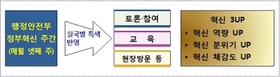 행정안전부는 8월부터 정부혁신에 대한 국민 체감도를 높이고 부내 혁신 분위기 확산을 위해 매월 “부내 정부혁신주간”을 지정하여 운영하고 있으며, ‘혁신역량 UP, 혁신분위기 UP, 혁신체감도 UP’ 등 ‘혁신 3UP’을 위해 실국별 특색을 반영하여 토론, 교육, 공연, 현장방문 등 다양한 방식으로 혁신활동을 진행하며, 이를 위한 정부혁신 전문가 풀과 부서·기관의 우수사례 등을 제공할 계획이다.