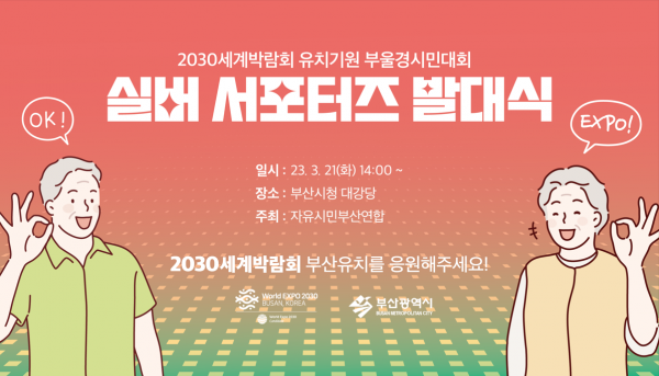 [충청뉴스큐] 부산시와 자유시민부산연합은 오늘 오후 2시 시청 1층 대강당에서 ‘2030부산세계박람회 유치기원 부울경 시민대회 및 실버 서포터즈 발대식’을 개최한다고 밝혔다.