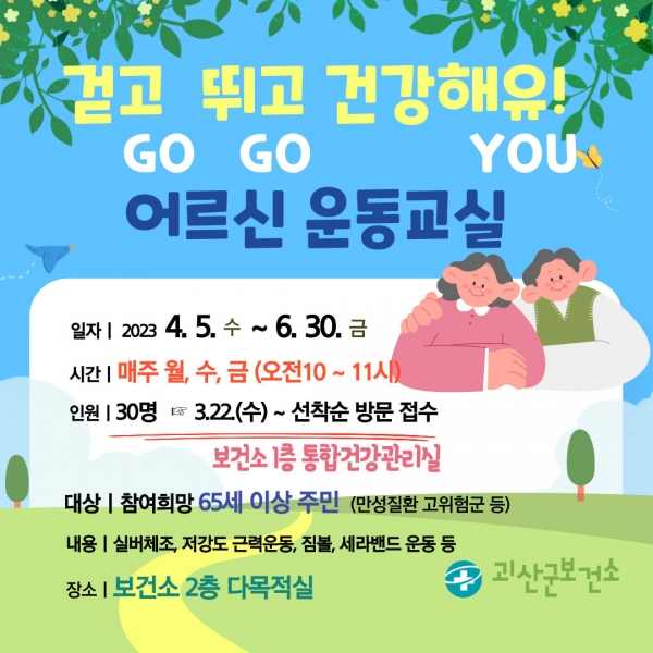 [충청뉴스큐] 충북 괴산군은 65세이상 주민의 건강증진을 위한 ‘걷고 뛰고 건강해유’” 운동교실 참여자를 모집한다고 밝혔다.