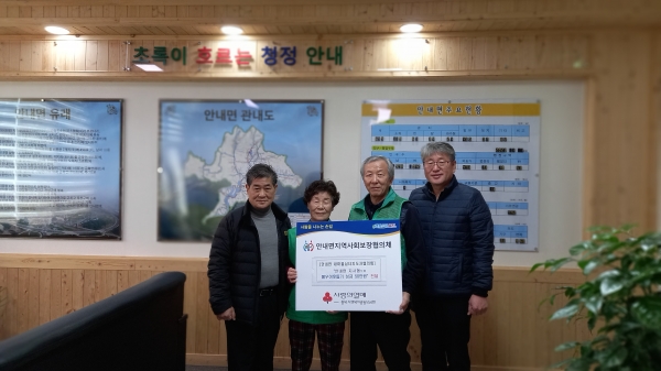기부된 성금 50만원은 안내면지역사회보장협의체에서 안내면의 저소득층 및 독거노인 등을 위한 다양한 사업비로 사용될 계획이라고 전했다.