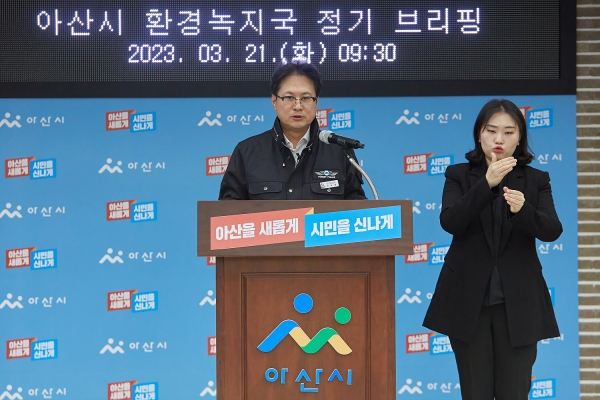선우문 아산시 환경녹지국장은 21일 시정브리핑을 통해 2023년 아산시 환경녹지 분야 7대 핵심사업인 곡교천 아트-리버파크 조성 신정호 아트밸리 지방정원 조성 산길 따라 삼백리 둘레길 조성 수변 생태공간 조성 클린아산 만들기 선도 문화생태공원 조성을 통한 시민휴식 공간 마련 산불 예방에 행정력을 집중하겠다면서 “민선 8기 원년을 맞아 시민 모두가 행복한 정주 여건 속에서 삶을 영위할 수 있도록 최선을 다하겠다”고 말했다.
