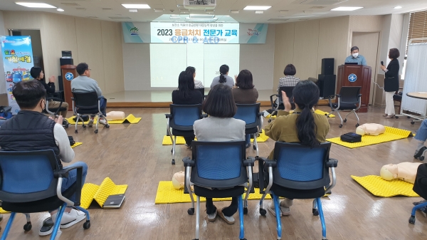교육은 현장에서 적절한 대처 및 의료지원 대응능력을 향상시키기 위해 상황별 응급처치 및 대응 심폐소생술 자동심장충격기 사용법 등 이론과 실습교육이 병행 실시됐다.