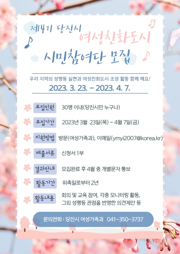[충청뉴스큐] 당진시가 지역의 성평등 실현과 여성친화도시 조성에 함께할 제4기 여성친화도시 시민참여단을 4월 7일까지 모집한다.