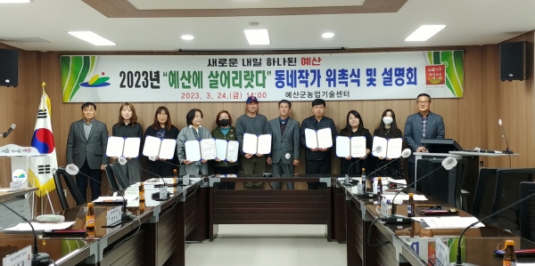 [충청뉴스큐] 예산군농업기술센터는 지난 24일 귀농귀촌을 희망하는 도시민에게 생생한 우리지역 현장정보를 전달하기 위한 ‘예산에 살어리랏다’ 동네작가 10명에게 위촉장을 수여하고 설명회를 개최했다.