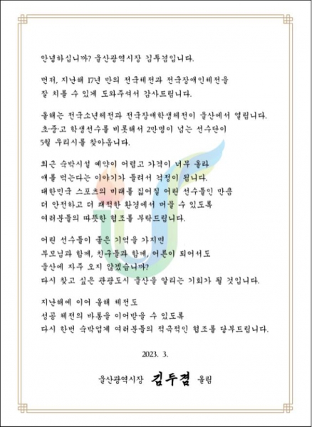 [충청뉴스큐] 울산시는 오는 5월에 개최되는 제52회 전국소년체육대회와 제17회 전국장애학생체육대회를 앞두고 김두겸 울산시장 명의로 ‘숙박업소 손님맞이 협조 서한문’을 발송했다고 밝혔다.