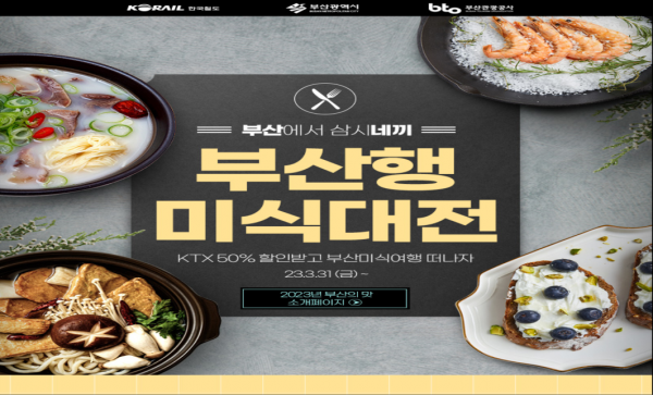 올해 다시 돌아온 부산행 시리즈는 ‘부산에서 삼시네끼’라는 타이틀로 오는 4월 1일부터 부산을 방문하는 국내외 관광객들에게 KTX 요금 최대 50% 할인과 함께 미식 테마상품을 결합해 부산을 찾은 여행객들의 입맛을 사로잡는 맛있는 여행을 선사할 예정이다.