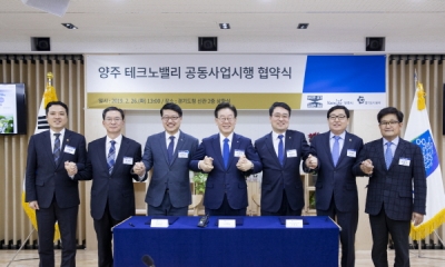 이재명 경기도지사와 김대순 양주부시장, 이헌욱 경기도시공사 사장은 26일 경기도청에서 정성호 국회의원, 박재만·박태희 경기도의회 의원 등 약 20여명이 함께한 가운데 양주테크노밸리 공동사업시행 협약을 체결했다.