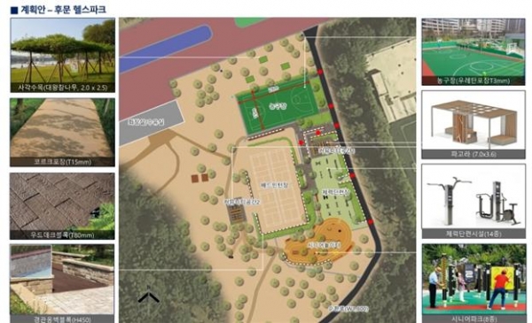 ‘헬스파크’ 는 기존 운동시설을 대폭 개선해 농구장, 배드민턴장, 야외운동기구로 구성된다.