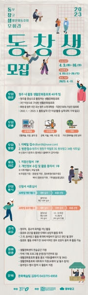 [충청뉴스큐] 청주시문화산업진흥재단은 오는 4월 16일까지 ‘2023 동·창·생 모여라’와 함께할 생활문화동호회를 모집한다.