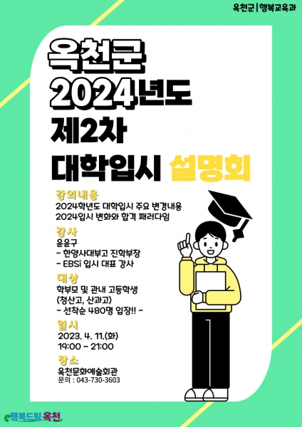 [충청뉴스큐] 충북 옥천군은 오는 4월 11일 옥천문화예술회관에서 ‘2024학년도 2차 대학 입시설명회’를 개최한다.
