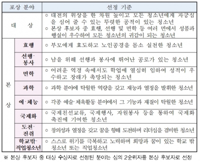 대전시 박문용 교육복지청소년과장은 “청소년의 건강한 성장과 친화적 환경조성에 기여한 분들과 또래 청소년에 귀감이 되는 모범 청소년들을 적극 발굴해 추천해 달라”고 당부했다.