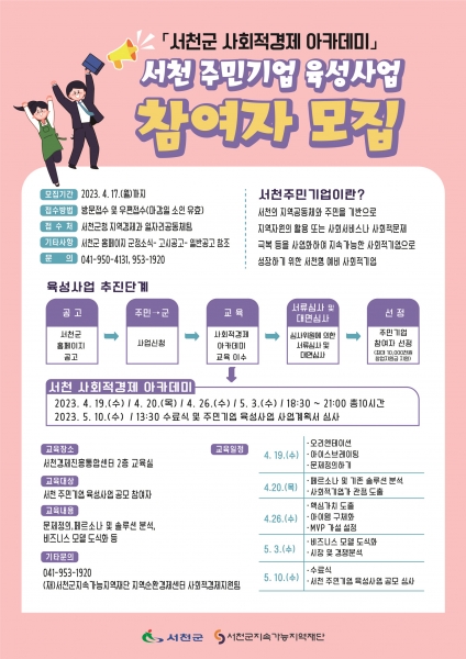[충청뉴스큐] 서천군이 오는 17일까지 사회적기업으로 원활한 진입을 위해 ‘서천군 주민기업 육성사업’ 참여자를 모집한다.